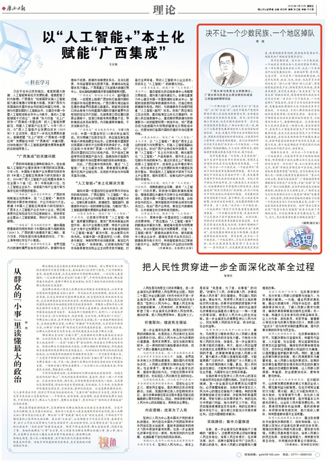 筑牢发展根基。“大家好,才是真的好”。这个生活中看似简单朴素的道理,实则是支撑国家和地区长远发展的坚实根基。一方面,“决不让一个少数民族、一个地区掉队”有助于筑牢高质量发展的精神根基。每个民族都是中华民族大家庭的平等一员,其发展事关铸牢中华民族共同体意识大局。世纪工程平陆运河加速开凿,让八桂各族儿女向海而兴、向海图强的百年梦想得以照进现实,真切感受到“国家记得我们”的温暖,在内心形成对中华民族的认同感和归属感。当发展的温度传递到每个地区、每个群体,民心就会更加凝聚、社会就会更加稳定,为发展提供强大精神力量。另一方面,“决不让一个少数民族、一个地区掉队”有利于筑牢高质量发展的物质根基。一个木桶无论有多高,其盛水的多少总是取决于其中最短的木板。如同此理,均衡性是实现高质量发展的重要前提。当百色芒果通过电商走向全国,当柳州螺蛳粉产业成为新增长点,当北海红树林变成“金树林”,区域发展协调性就能不断增强,发展空间布局就更加合理。事实表明,决不让一个少数民族、一个地区掉队,不仅不是额外的负担,反而让高质量发展获得了更大的空间——其价值在于,让发展既有速度更有温度,既有规模更有均衡,既有效率更有公平,朝着更加广阔的前景稳步前行。