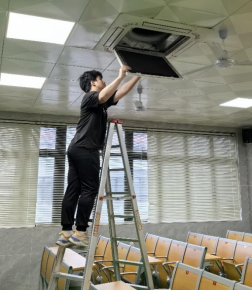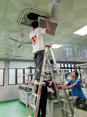 空调2301班的同学们在实训结束后,得知老师办公室和教室的空调设备需要清洗维护,主动提出为老师清洗空调。