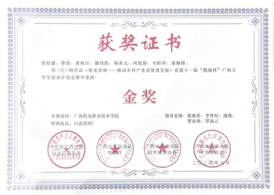 其中,由黄海贵、覃业妍等教师指导的《地龙养殖——推动乡村产业高质量发展》项目,凭借其独特的创新视角、扎实的研究基础及显著的社会价值,成功入围决赛,并最终摘得区赛金奖的桂冠。这一成绩不仅是对项目团队努力与才华的肯定,也是我院在培养具有创新精神和实践能力的高素质人才方面所取得优秀成果的见证。