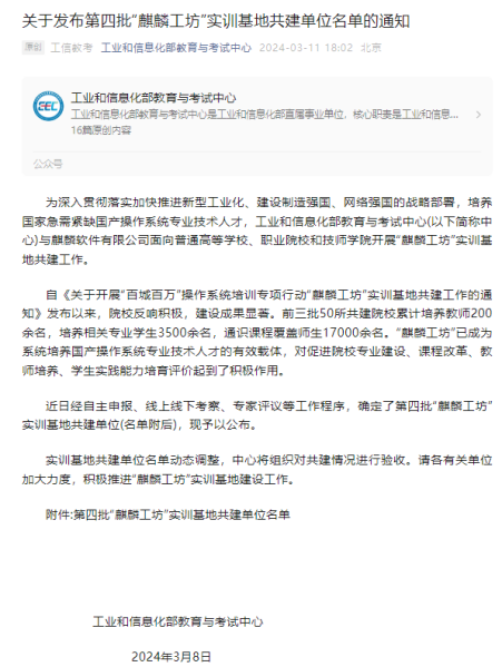 “麒麟工坊”实训基地是由工业和信息化部教育与考试中心与麒麟软件有限公司面向普通高等学校、高等职业学校评选的共建实训基地,旨在为深入贯彻落实加快新型工业化,建设制造强国、网络强国的战略部署,为国家培养急需紧缺国产操作系统专业技术人才。