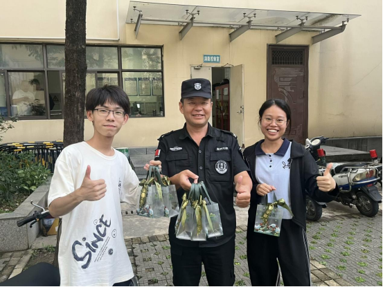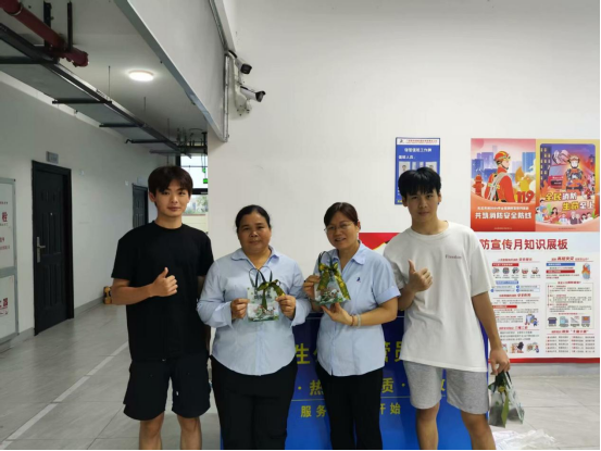 在包粽子的过程中,同学们心中始终怀着一份感恩之情。他们将亲手包好的粽子送给了一直默默付出的宿管人员、保安和保洁人员,用最质朴的方式表达对他们的敬意与感激。一句“您辛苦了”,一份带着余温的粽子,让平日里默默付出的后勤工作者感受到被尊重与关怀,也让参与活动的学生深刻体会劳动价值,学会用行动回馈他人。这种将感恩之心转化为具体行动的过程,正是落实“三全育人”中“实践育人” 的生动体现。