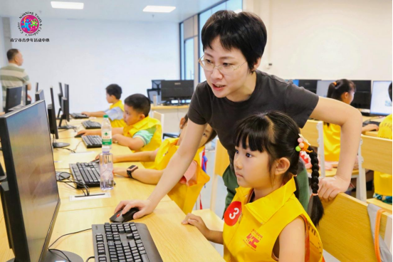 研学小队员们走进实训室机房,在陈玉芸老师的指导下学习计算机安全知识,尝试电脑绘画制图,在实践中理解数字世界的运行逻辑。
