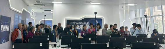 在元宇宙新质生产力实训实践中心,覃浩钊老师为退休老教师们细心介绍讲解了虚拟现实技术的发展和应用,随后在卓超务、黄亮等学生志愿者的协助下,老教师们轮流体验了裸眼3D技术与沉浸式人机交互项目,新奇的技术体验激发了大家浓厚的兴趣,现场气氛活跃,老教师们积极参与各项目的体验。