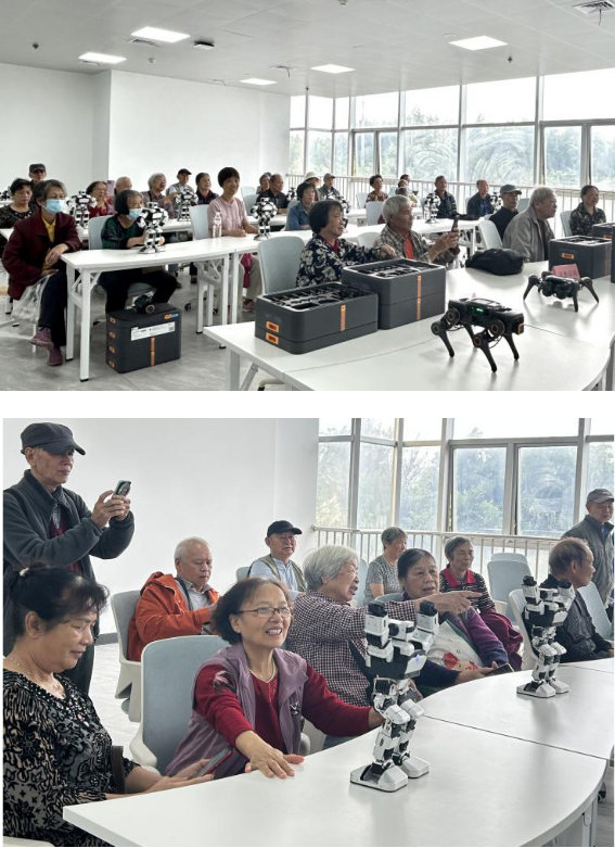紧接着,老教师们移步至产教融合人工智能培训鉴定实训实践中心。由我院师生团队自主研发的机器人集群伴随着动感音乐,精准而流畅地完成了一系列高难度的集体舞蹈动作。整齐划一的舞姿、科技感十足的表演,引发老教师们纷纷拍照记录和热烈讨论。
