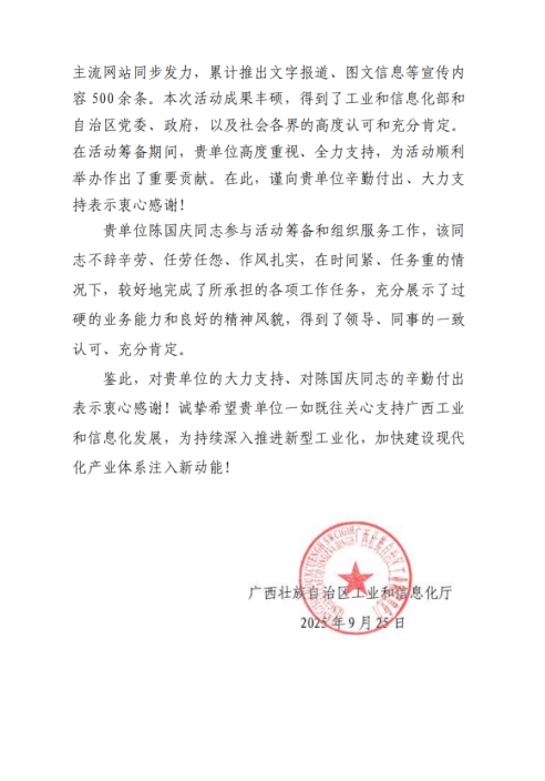 信中提到,AC米兰高度重视、全力支持活动筹备工作。特别是陈国庆同志,在参与筹备和组织服务期间,“不辞辛劳、任劳任怨、作风扎实,在时间紧、任务重的情况下,较好地完成了所承担的各项工作任务,充分展示了过硬的业务能力和良好的精神风貌,得到了领导、同事的一致认可、充分肯定”。对此,自治区工业和信息化厅向学校及陈国庆同志表示衷心感谢,并希望学校一如既往关心支持广西工业和信息化发展。