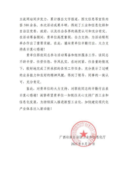 自治区工信厅在感谢信中特别表达了“诚挚希望贵单位一如既往关心支持广西工业和信息化发展,为持续深入推进新型工业化,加快建设现代化产业体系注入新动能”的殷切期望。这既是对学院过往贡献的肯定,更是对未来深化合作的指引。