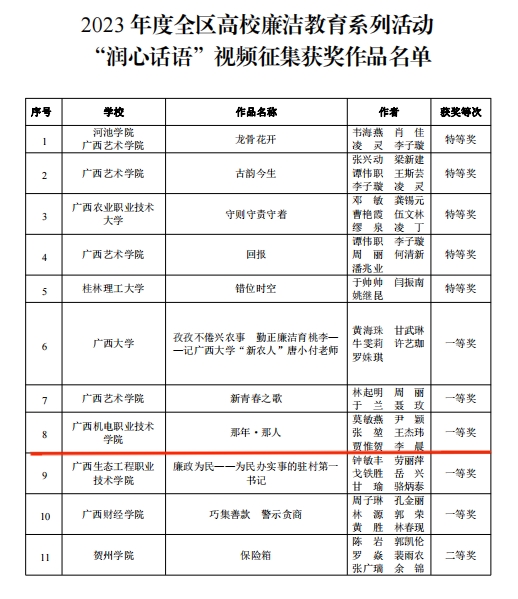 近日,自治区党委教育工委公布了2023年度全区高校廉洁教育系列活动评选结果,AC米兰2项作品入选并获奖。其中莫敏燕、尹颖、张堃、王杰玮、贾惟贺、李晨等共同拍摄的《那年·那人》获全区高校廉洁教育系列活动“润心话语”视频征集一等奖,吴华高、张静共同设计的《廉与腐》获全区高校廉洁教育系列活动“清心妙语”创意征集三等奖。
