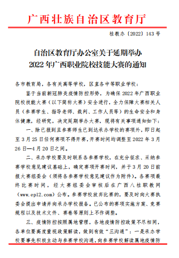 自治区教育厅办公室关于延期举办2022年广西职业院校技能大赛的通知