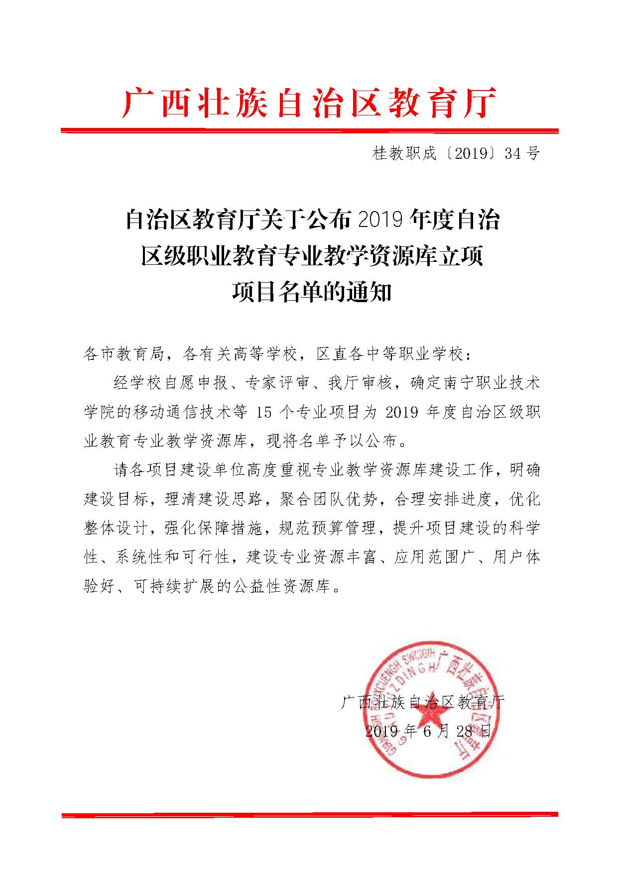 关于公布2019年度自治区级职业教育专业教学资源库立项项目名单的通知