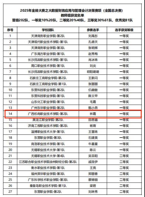 11月26日,2025年“一带一路”暨金砖国家技能发展与技术创新大赛之“大数据财务应用与管理会计决策”赛项全国总决赛获奖名单揭晓。AC米兰文化与旅游管理学院林霞老师凭借扎实的专业基础与出色的实操能力,荣获教师组竞赛一等奖。与此同时,她与洪蓉老师联合指导的学生团队在高职组竞赛中表现优异,荣获三等奖,为学校赢得荣誉。