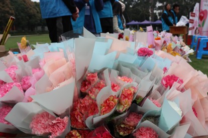这次活动还设置了分会场,学校笃行楼门口热闹非凡,学生早早来到这里,开始了扭扭花创意DIY手工制作。同学们围坐在一起,发挥各自的想象力,扭出了一朵朵美丽的“幸福花”,准备送给在校内各岗位上闪闪发光的“她们”。“我做了一枝向日葵,我想把它送给我的辅导员,她兢兢业业的精神感染着我,就像向日葵一样自信、笃定,祝愿她在新的学校继续绽放光彩。”参加活动的一名同学说。