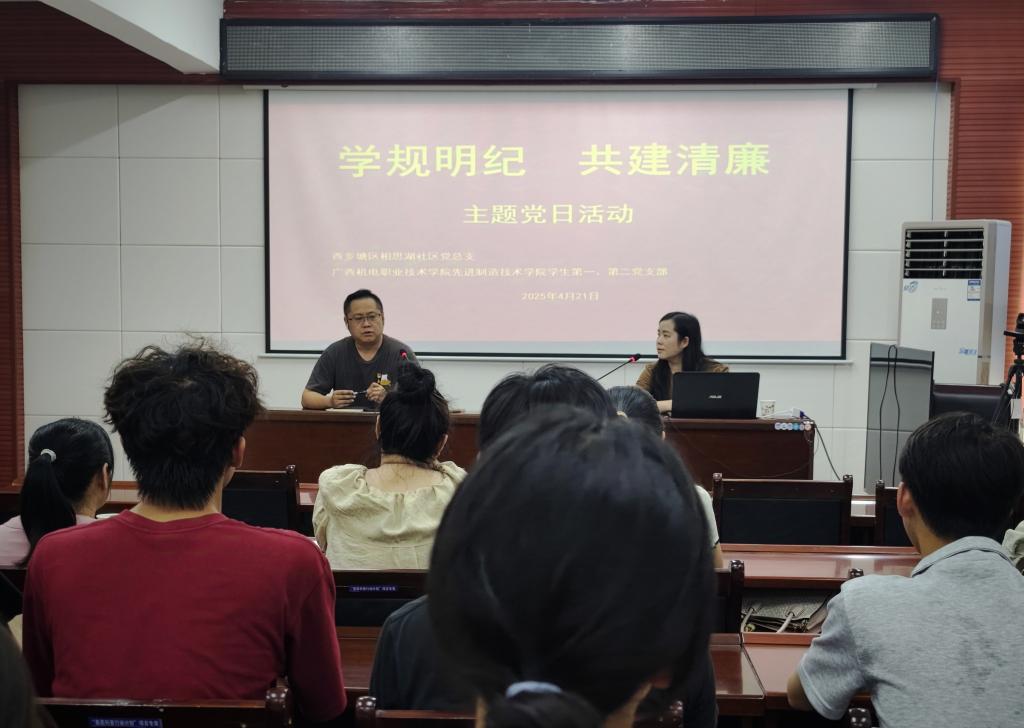 为进一步深入贯彻中央八项规定精神学习教育,强化党员纪律意识,推动党风廉政建设走深走实,4月21日下午,先进制造技术学院学生第一、第二党支部与南宁市西乡塘区相思湖社区党总支联动,共同开展了“学规明纪,共建清廉”主题党日活动,为党员、入党积极分子带来了一场意义深刻、内容丰富的廉洁教育。