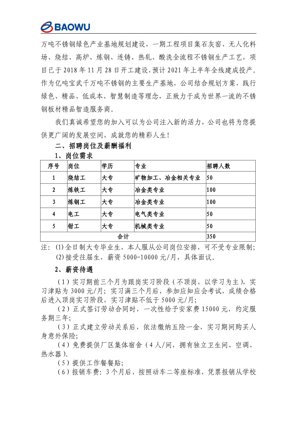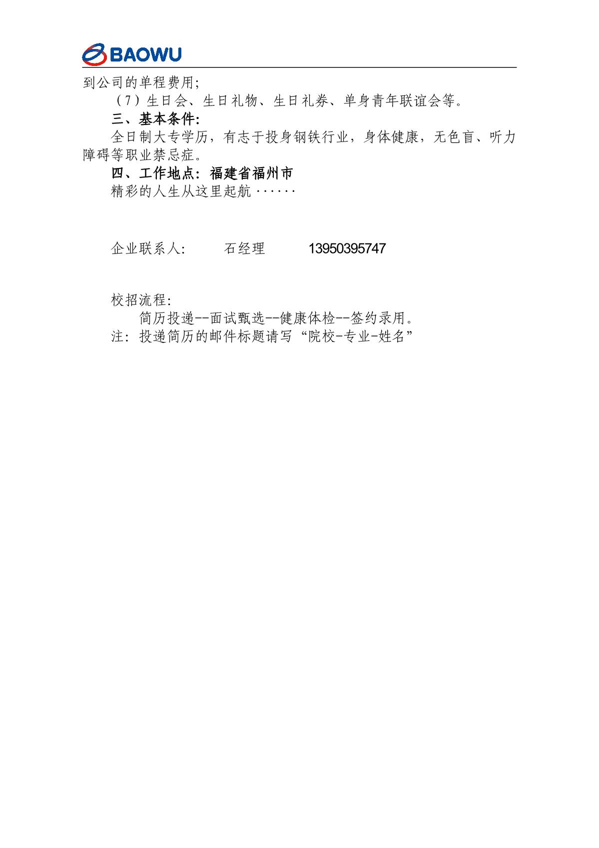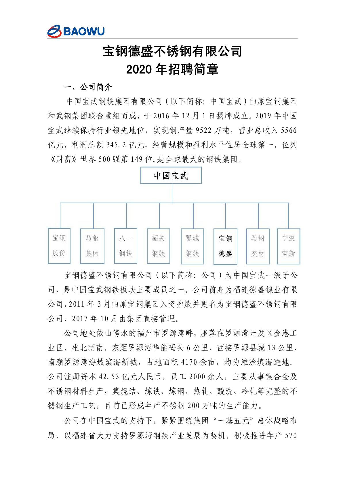 宝武钢铁集团福州分公司招聘简章