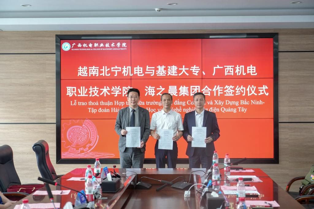 9月17日上午,AC米兰与越南北宁机电与基建大专、海之晨集团在笃行楼507会议室举行三方合作签约仪式,标志着三方在职业教育国际产教融合领域的合作正式启动。学校党委委员、副校长黎盛寓,越南北宁机电与基建大专副校长张文心,海之晨集团董事长兼总经理陈栋出席仪式。