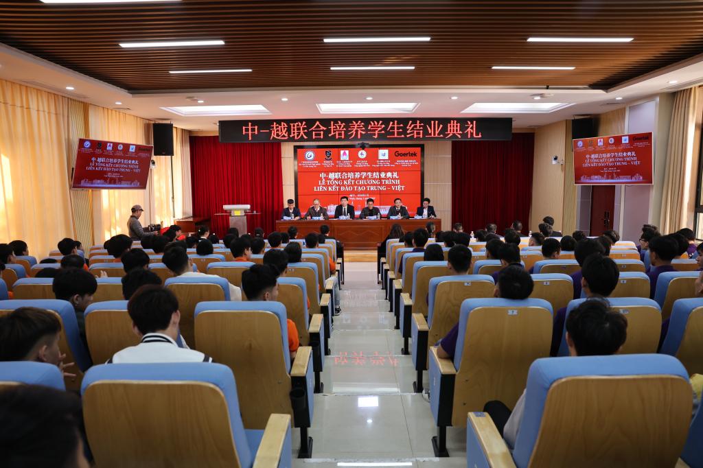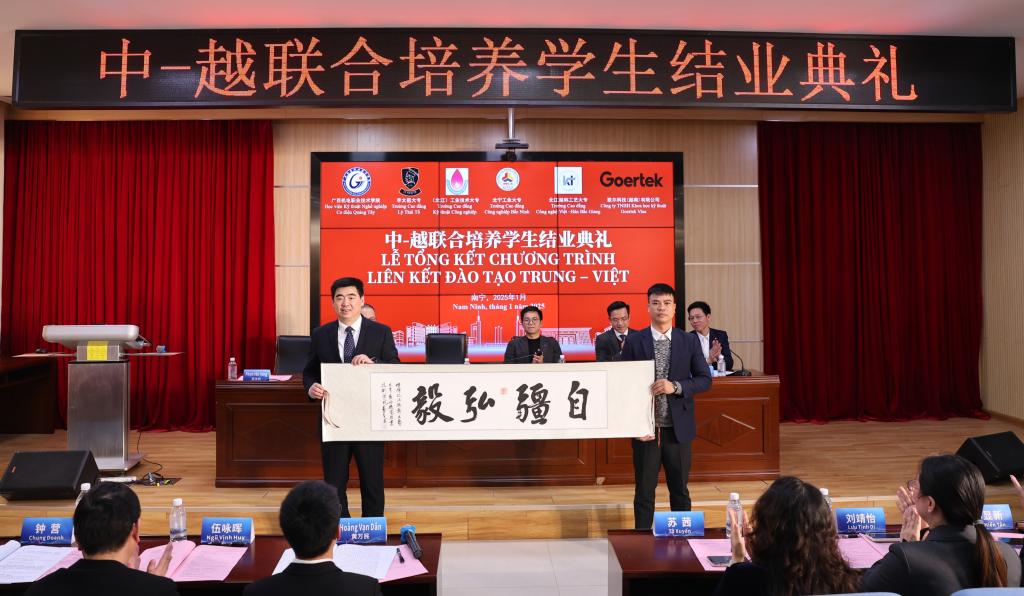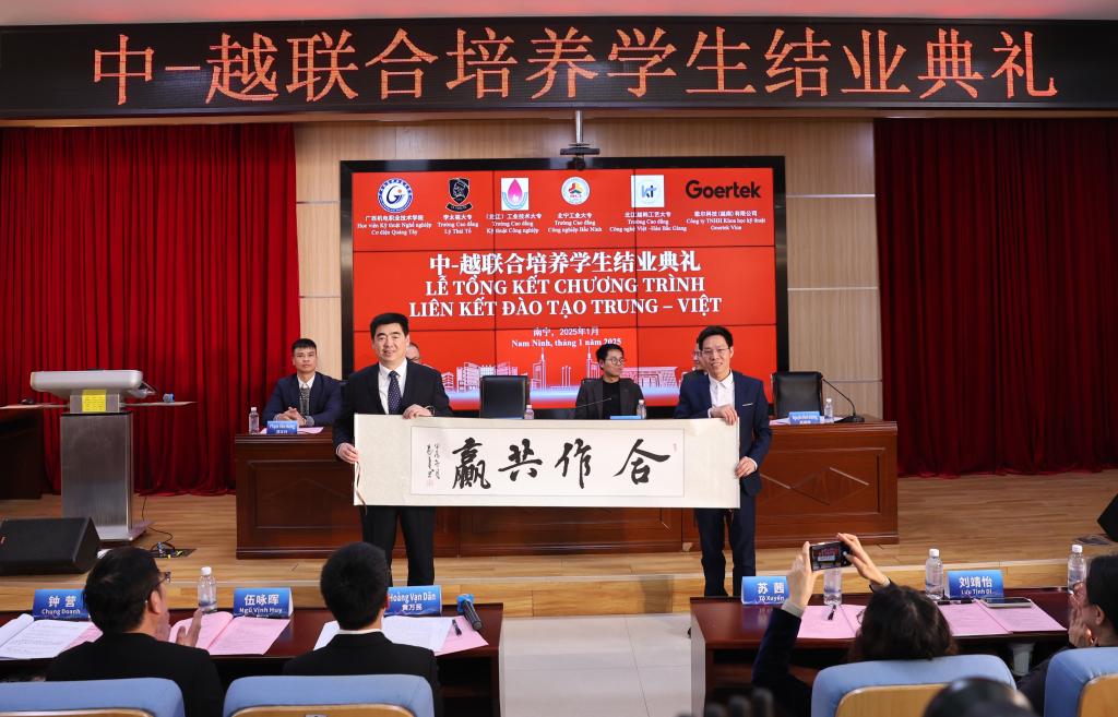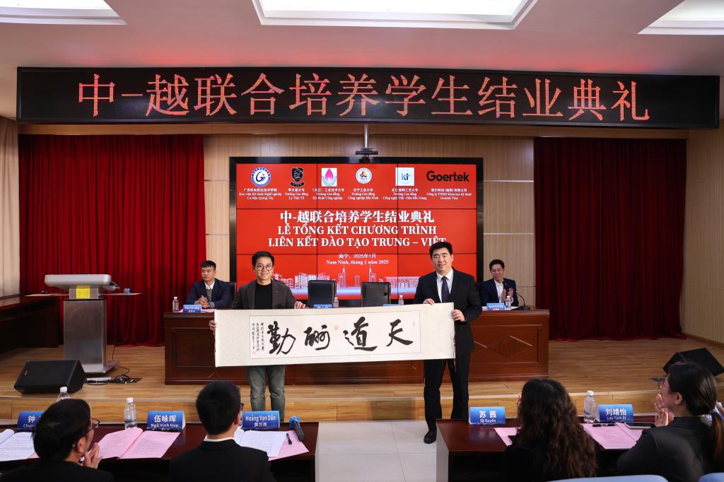 出席典礼的中越院校和企业领导共同为越南学生代表颁发了结业证。黄小敬书记与越南合作院校和企业的领导互赠了礼品。