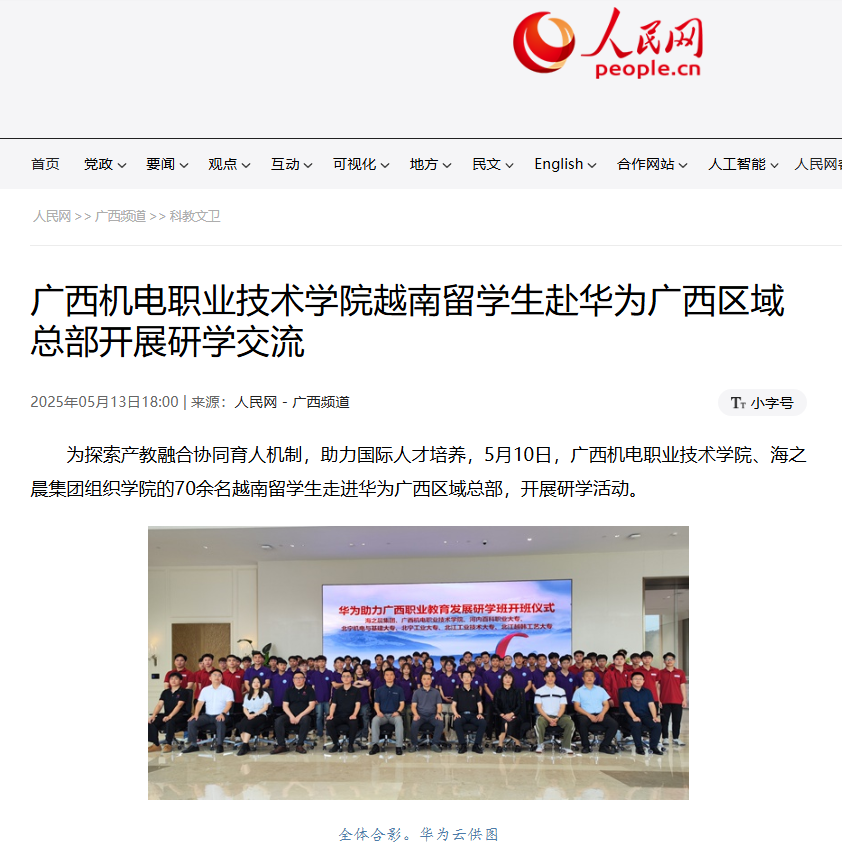 编者按:5月13日,《人民网》专题报道我院越南留学生赴华为广西区域总部开展研学交流。文章从“创新产教协同育人机制”“深化校企双元育人实践”“拓展国际职教合作平台”“构建根技术课程体系”“强化实践育人成效”五个维度,系统阐释了学校通过“校-企-校”联合培养模式,将产业前沿技术融入国际人才培养,打造具有数字基因、国际视野的职业教育新生态,为服务“一带一路”建设培育数字技术人才的重要实践。报道深入展现此次活动在深化校企合作、推动国际职业教育交流等方面的重要意义,同时引发社会对我院与合作单位创新教育实践的广泛关注。