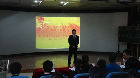 大会在雄壮的国歌声中拉开帷幕。会议首先审议并通过大会的选举办法、新一届委员会候选人的资格审查报告、第九届团总支、学生会的工作报告等程序。在候选人演讲竞选阶段,候选者们用热情饱满的演讲表达了对团学工作的执着与热爱,逐一讲述了对团学工作的理解与认识,阐明了本身的优势,并根据在工作中总结的经验提出建议。他们自信从容、热情洋溢的神态以及透彻入理的分析一次次将大会气氛推向高潮。最终经过与会代表们的民主选举,CAD1201班的文成才等7名同学当选为第十届团总支委员、模具1202班的韦乃峰等24名同学当选为第十届学生会委员。