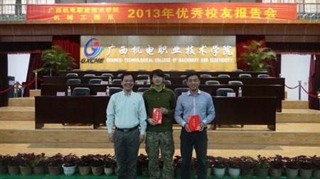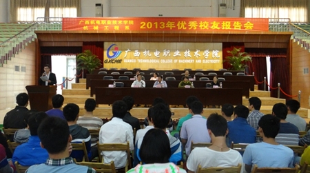 11月16日下午,由我系主办的2013年优秀校友报告会在学院体育馆如期举行。数控07届校友孙瑞宝,现任桂林电子科技大学职业技术学院教学实训部主任,及模具08届校友韦林涛,现任柳州广菱汽车技术有限公司技术部CAE系系长应邀为我系学生作报告。系领导、各专业负责人、学工人员和全体同学到场聆听报告。