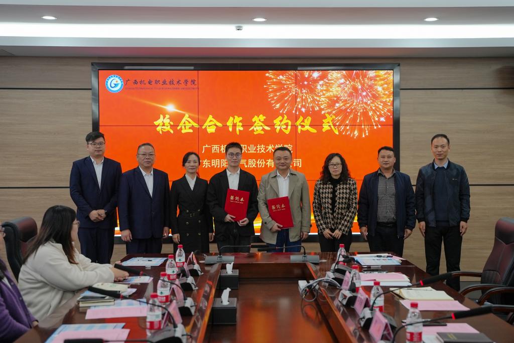 最后,在各方的见证下,广东明阳电气股份有限公司与广西机电职业技术学校双方代表现场签订校企合作协议,在共建订单班和学徒班、设置企业教师工作站、派遣专业骨干教师挂职锻炼、共同制定专业人才培养方案、共同开发专业课程教学资源等方面达成共识。罗满处长对本次签约表示衷心祝贺,希望政校企各方本着精诚合作的态度,严格履行协议,齐心协力,真正实现校企优势互补。
