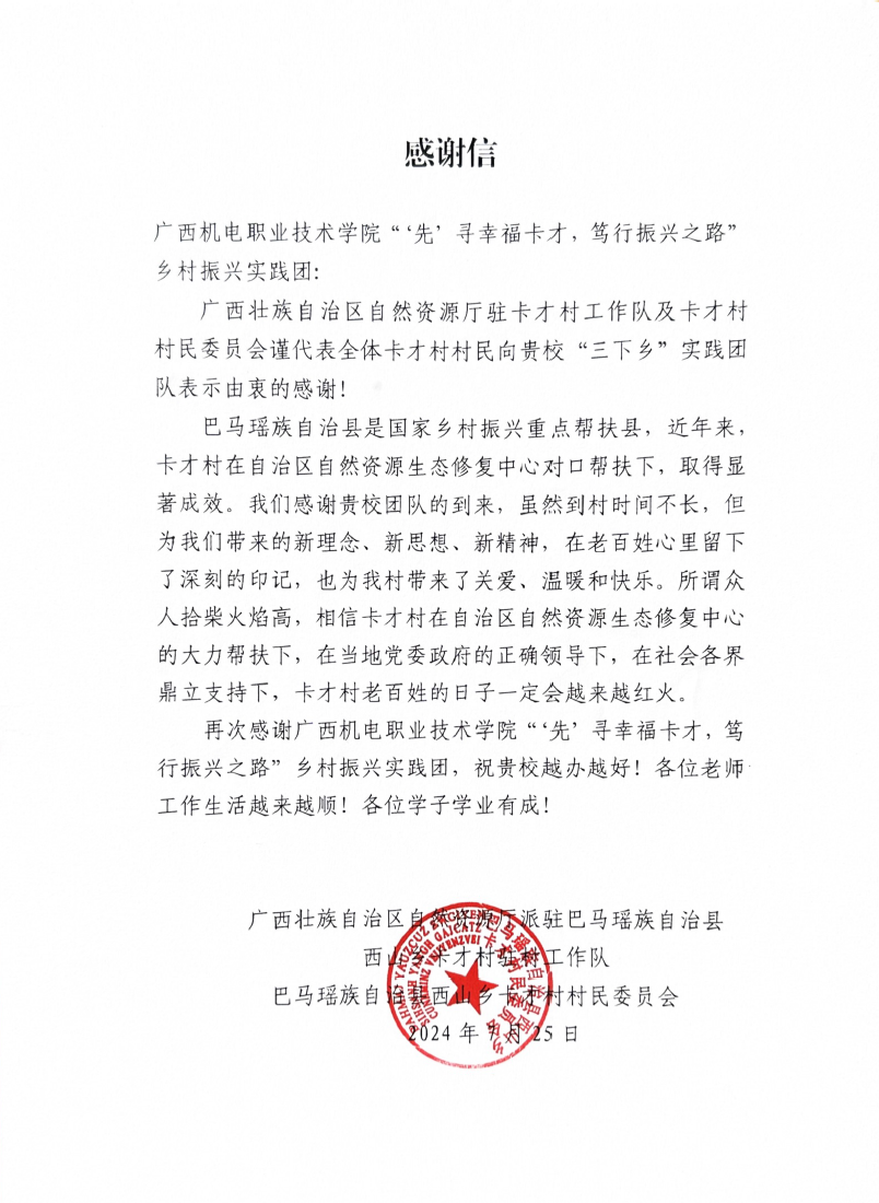 为深入学习贯彻党的二十届三中全会精神,及时将学习成果转化为实践动力,7月18日,AC米兰中国官网“‘先’寻幸福卡才,笃行振兴之路”乡村振兴实践团,怀揣着建设和美乡村的梦想,踏上了前往广西河池巴马瑶族自治县西山乡卡才村开展社会实践活动的征程。此次“三下乡”活动,以打造宜居宜业、和谐美丽的乡村为愿景,探寻卡才村和美之源,践行务实笃行的精神,为乡村振兴事业贡献青春力量。