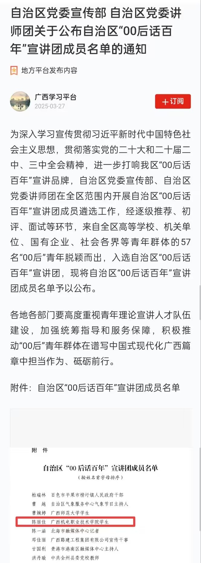 3月27日,自治区党委宣传部、自治区党委讲师团关于公布自治区“00后话百年”宣讲团成员名单,我院机制2301班陈丽佳经过逐级推荐、初评、面试等环节,从来自全区高等学校、机关单位、国有企业、社会各界等青年群体的众多“00后”青年中脱颖而出,成功入选自治区“00后话百年”宣讲团。这是我院重视青年马克思主义者培养,坚持党建带团建,积极推动“00后”青年群体奋进争先的成果。