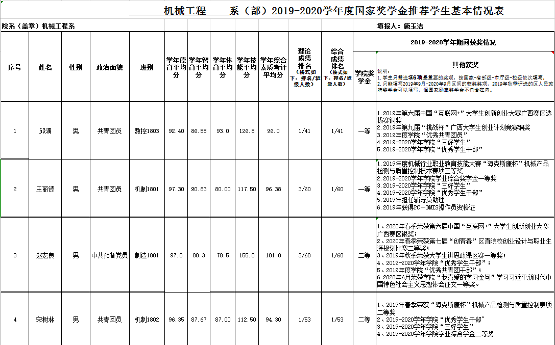 机械工程系2019-2020学年度国家奖学金推荐学生基本情况公示