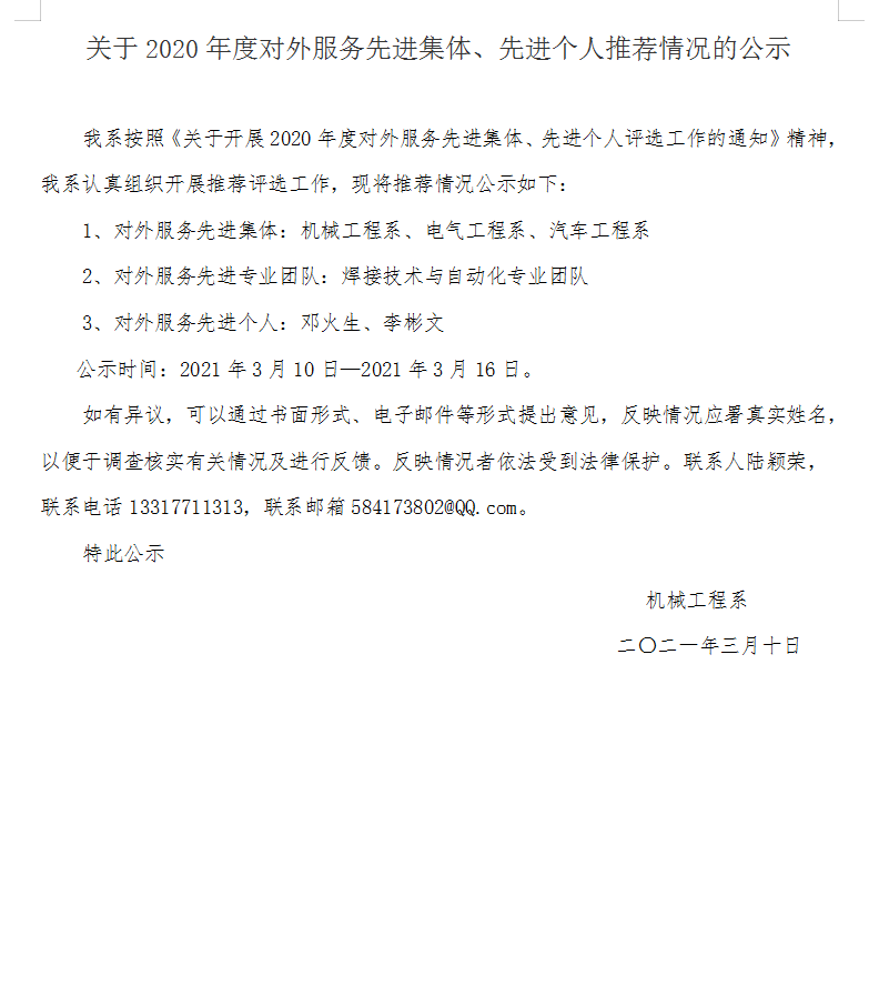 关于2020年度对外服务先进集体、先进个人推荐情况的公示