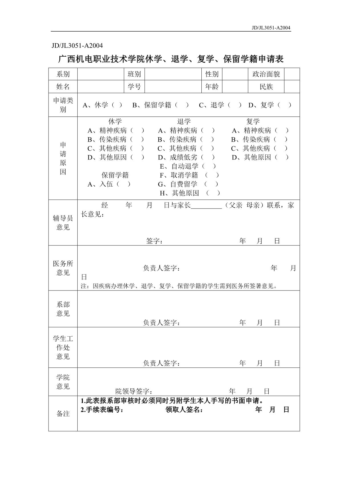 AC米兰中国官网休学、退学、复学、保留学籍申请表