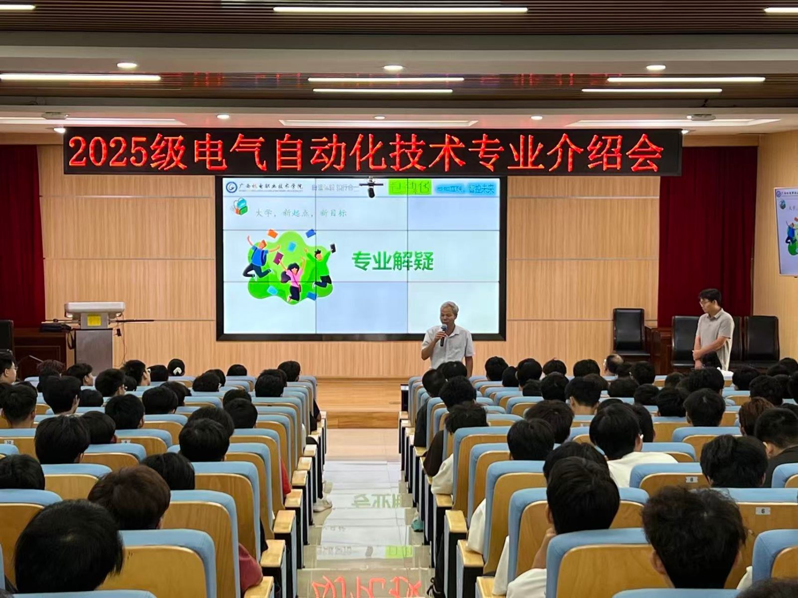 电气自动化技术专业于9月19日下午举办新生专业介绍会。团队教师宁显斌以机器人、智能工厂、机器视觉等实际应用为切入点,用通俗的语言展现了自动化技术在多个领域的重要作用,梳理了专业从传统控制到智能信息融合的发展脉络,并强调其在推动制造业高质量发展中的关键使命。他鼓励新生做好时间规划、专注学业、全面提升综合素质。多位教师现场分享优秀学长成长路径,并为新生答疑解惑,为他们未来的学习与职业规划指明方向。