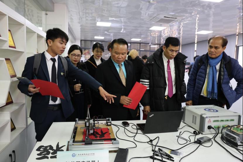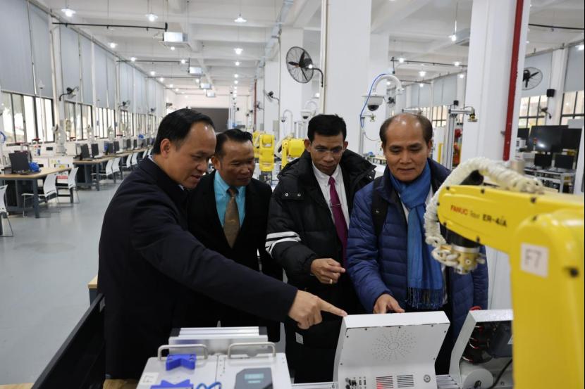 钟国文院长带领代表团参观了精益生产实训中心、智能制造工业机器人实训中心,为代表团介绍了智能加工单元综合实训系统的操作流程和学生学习、就业的情况。在创新实践中心,代表团看到学生自己设计制造的智能写字机器人、智能水果采摘机械手、体感小车等设备,并体验了一把体感小车的乐趣,由衷地竖起了大拇指赞叹“中国的技术,中国的创新,中国的制造,很棒!”,对中国学生的创新能力和技术水平给予了高度评价。