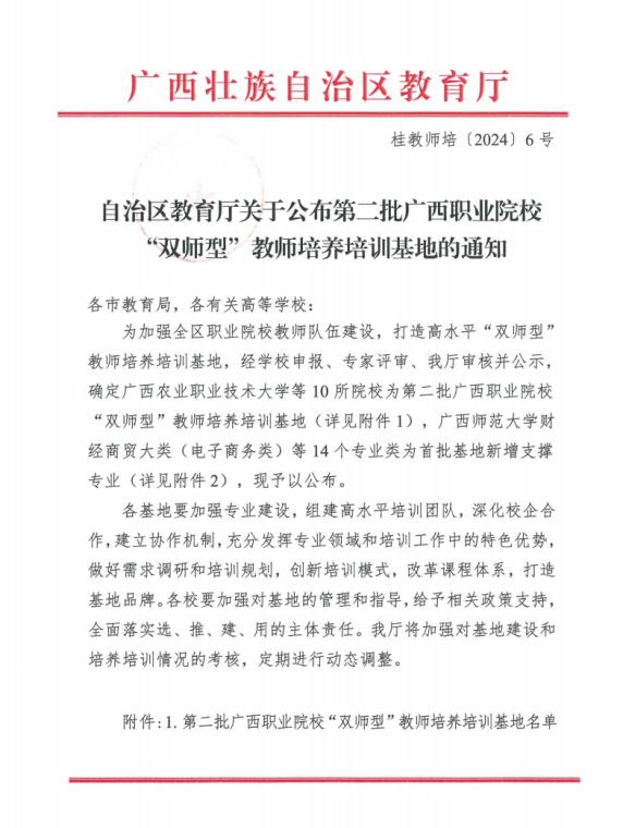 近日,根据《自治区教育厅关于公布第二批广西职业院校“双师型”教师培养培训基地的通知》(桂教师培〔2024〕6号),AC米兰成功入选第二批广西职业院校“双师型”教师培养培训基地,重点支撑的专业领域包括装备制造大类下的机械设计制造类和汽车制造类。
