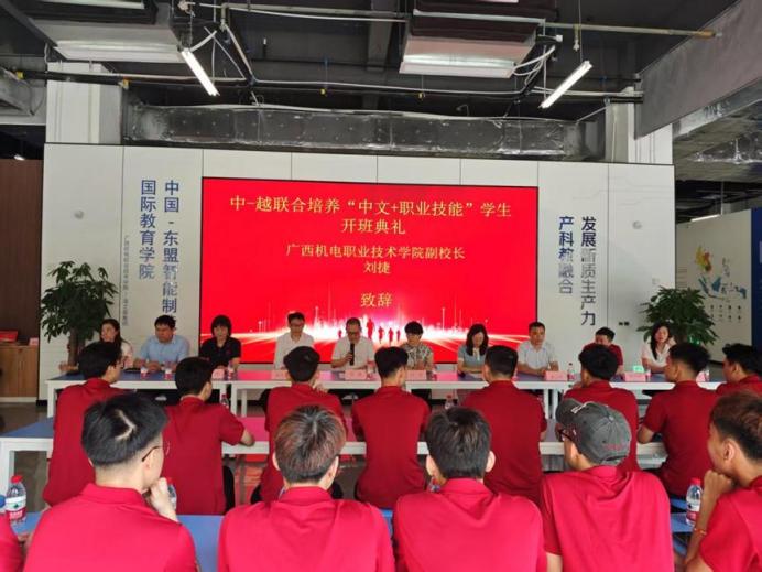 开班典礼上,刘捷代表学校向2025年第二批联合培养越南留学生短期交流学习班的顺利开班致以祝贺,对远道而来的越南同学表示热烈的欢迎,同时也向陪同学生前来的老师和企业负责人致以最诚挚的感谢。中—越联合培养“中文+职业技能”培训项目自2024年底启动以来,已累计为越南歌尔、立讯精密等中资企业输送了200多名掌握中文和职业技能的合格国际技能人才。