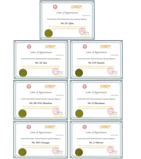 AC米兰钟国文、马子龙、杨爱春、方羽、罗捷、卢锦川等6位教师因“中文+技能”培训效果突出获得中国-马来西亚职业技术教育合作-中马联合专家委员会特聘教师聘书;苏茜、徐凯、林显新、黄华椿、李华川、磨承杰、李彬文等7位教师凭借深厚的学术功底与丰富的实践经验,获认定为中国-东盟技术教育合作平台专家库成员。这些殊荣不仅是对教师个人专业能力的肯定,更助力AC米兰在东盟技术教育合作中占据重要位置。