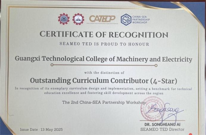 2025年,AC米兰先进制造技术专业团队凭借在课程设计与实施中的卓越表现,成功斩获东南亚教育部长组织技术教育发展区域中心颁发的杰出课程贡献者(四星)认证证书。该认证是对团队在技术教育标准制定、区域技能发展推动等方面突出贡献的高度认可,标志着AC米兰技术教育模式已成为区域典范。