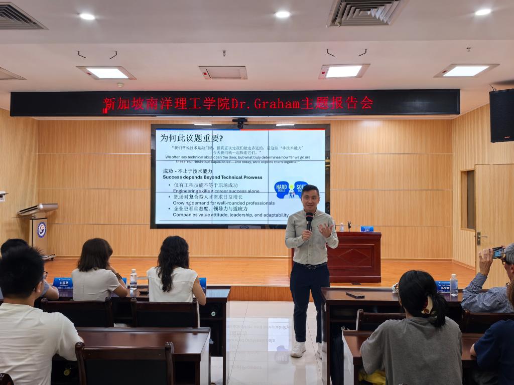 研讨会后,吴福庆为先进制造技术学院、智能焊接技术学院、汽车工程学院的师生代表作 “职场成功之路-工程技能之外的必备素质” 主题报告。他强调,仅有工程技能不等于职场成功,当今世界对复合型人才的需求日益增长,工程技能是硬实力,而良好的沟通能力、情绪管理能力、协作与团队精神、终身学习能力、领导力及时间管理能力是软实力,硬实力与软实力兼备是成就工程师的成功之道。吴福庆还解答了学生关于专业认知、就业规划、自我提升等方面的疑问,希望学生有机会到新加坡参观和学习,现场互动气氛良好。吴福庆博士的主题报告为师生们带来宝贵启示,其强调的 “硬实力与软实力兼备” 理念,将激励师生们在未来学习与职业生涯中不断提升自我,成长为具备多维素养的复合型人才。