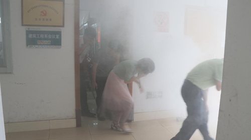 演练正式开始,实验室内浓烟弥漫,实验室老师指挥实验室内所有人员马上停止活动并撤离现场,参演师生捂住口鼻弯腰低头跑向较近的安全出口,沿逃生通道有序疏散撤离到空地,疏散过程有条不紊。
