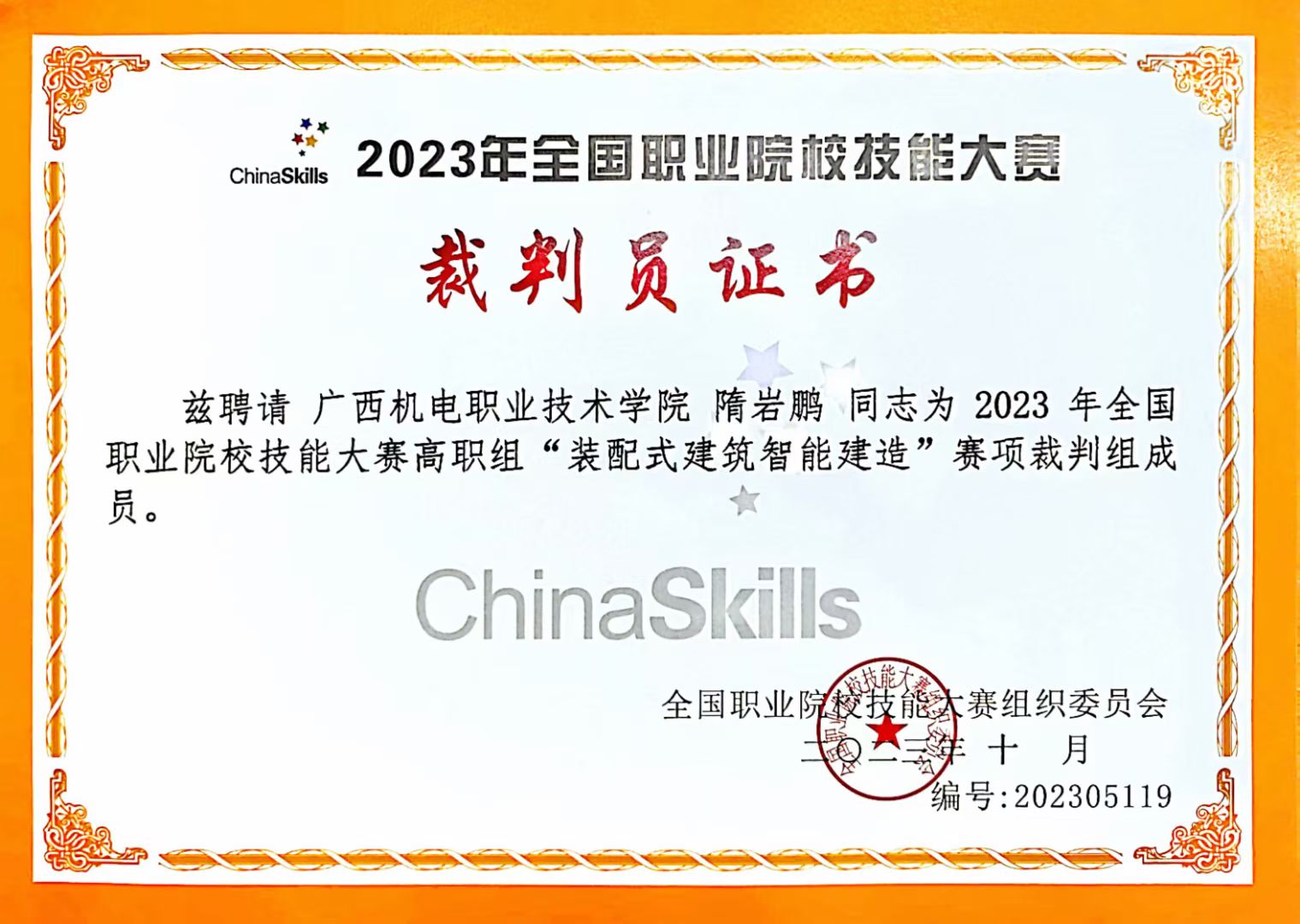 10月27至30日,由教育部、国家发展和改革委员会、科学技术部、工业和信息化部等部委主办,2023年全国职业院校技能大赛高职组“装配式建筑智能建造”赛项在上海举办。全国30个省、自治区、直辖市57支参赛代表队,共171名参赛选手同场竞技,建筑工程学院智能建造教学创新团队隋岩鹏老师受聘担任国赛裁判工作。