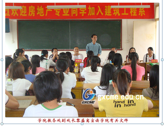 2011年9月23日下午16:50,工商管理系与建筑工程系在2504教室举行了商务经纪与代理专业(房地产经纪方向)交接仪式。学院教务科研处副处长黎盛寓、工商管理系主任严金才、建筑工程系主任李晓东、建筑工程系党总支书记蓝兴洲、建筑工程系副主任周玲等出席了交接仪式。