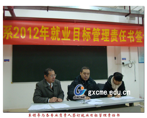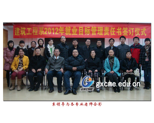 2012年1月12日下午,建筑工程系就业工作责任书签订仪式在图书馆一楼系部会议室举行。系主任李晓东,系党总支书记蓝兴洲,系副主任周玲及各专业老师等参加了会议。会议由系党总支书记蓝兴洲主持。系主任李晓东、系党总支书记蓝兴洲分别和各专业负责人庄严地在就业工作责任书签字:承诺保证各专业完成就业工作目标。
