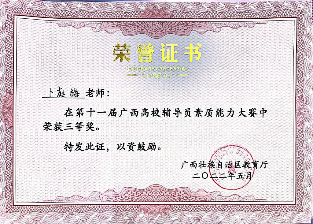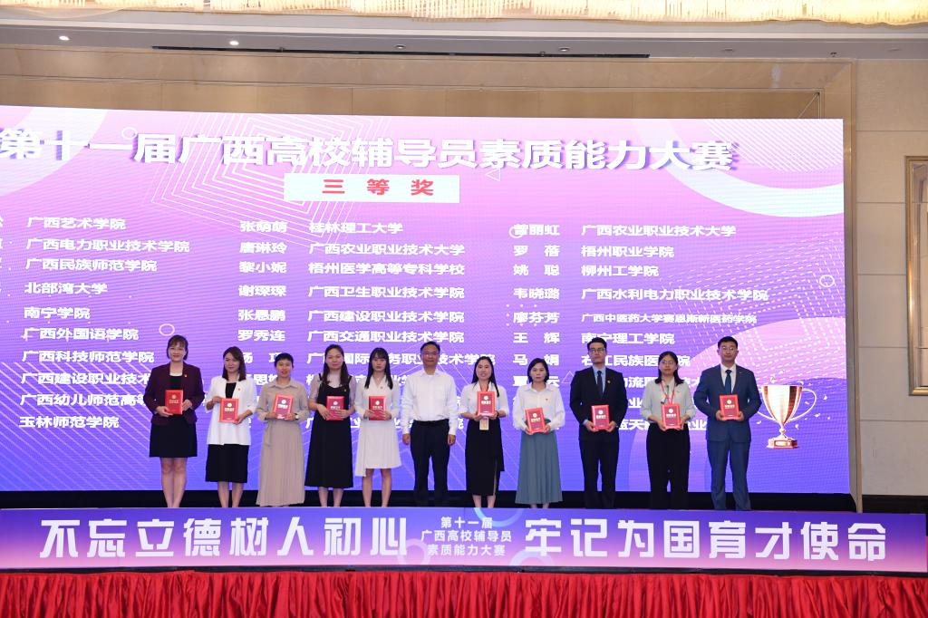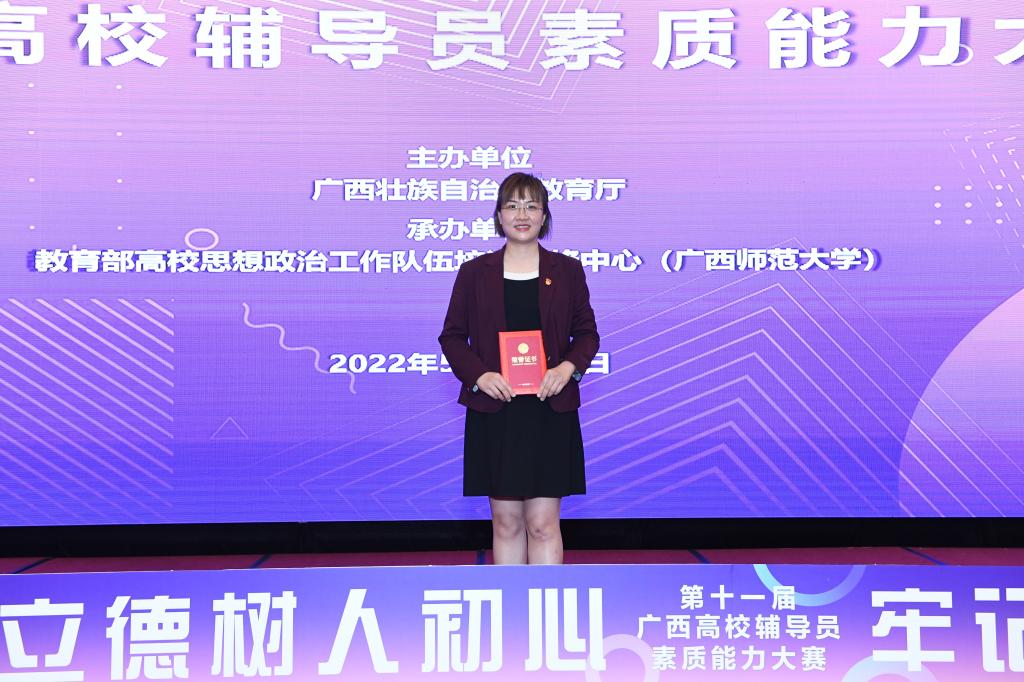 5月14日,第十一届广西高校辅导员素质能力大赛在广西师范大学圆满落下帷幕。本次大赛由广西壮族自治区教育厅主办,教育部高校思想政治队伍研修培训中心(广西师范大学)承办。我院党总支副书记、专职辅导员卜庭梅同志凭借扎实的业务能力和过硬的专业技能,获得三等奖的好成绩。