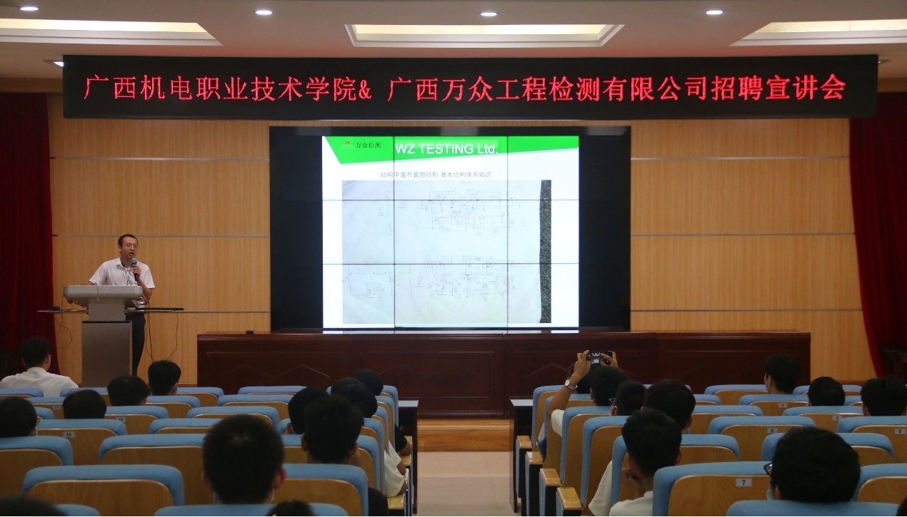 6月17日,广西万众检测工程有限公司(“万众检测”)2022届实习生校园招聘宣讲会在第六教学楼第二学术报告厅如期举办。我院工程造价专业全体专任教师、专职辅导员参加本次招聘宣讲会,宣讲会由工程造价专业带头人郭容宽副教授主持。