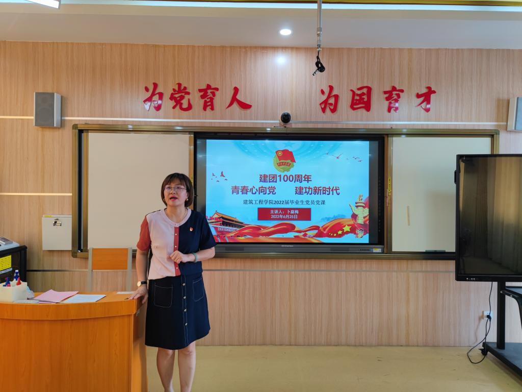 6月25日下午,建筑工程学院党总支在第六教学楼举行“献礼建团100周年·百年团史青年学”2022届毕业生党员教育党课。本次党课由学院党总支副书记卜庭梅授课,全体毕业生党员、预备党员及入党积极分子参加本次主题党课活动。