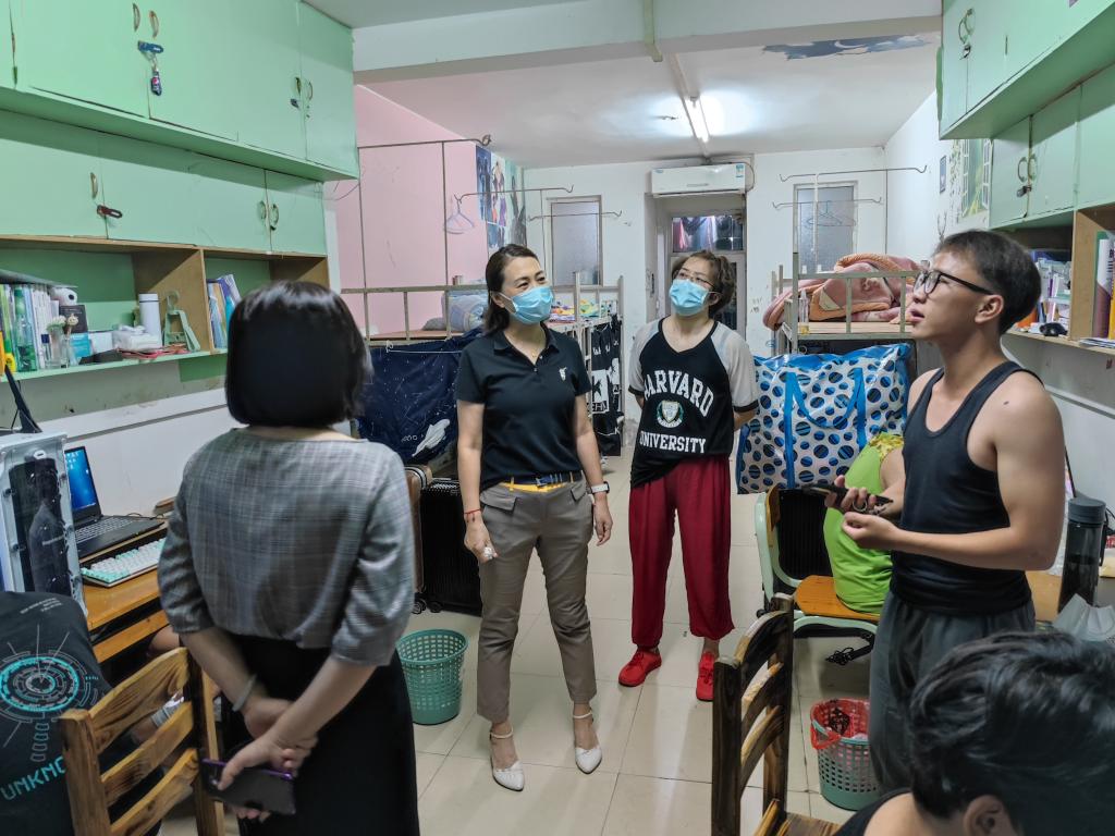 建筑工程学院院长李哲、党总支副书记卜庭梅、副院长谢启星、郭容宽等学院领导深入沁宁园、风华园检查学生返校情况。走访过程中,学院领导对同学们致以关心和问候,并与同学们进行亲切的交谈,了解同学们的住宿和生活情况,关切地询问他们来自哪里、对本专业的认知、是否有学习压力等。学院领导还就疫情防控期间线上线下相结合的学习方式与同学们进行深入交流,重点了解同学们对网络教学的反馈。