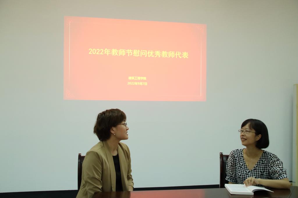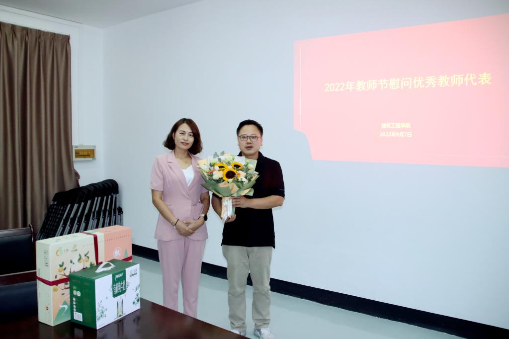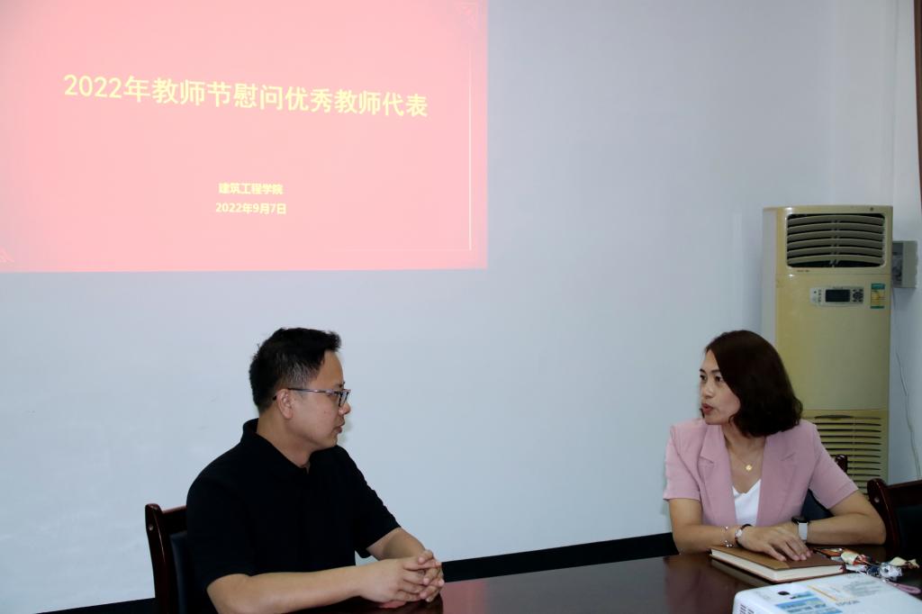金秋沃野,丹桂飘香。在第38个教师节来临之际,又时逢中秋节,为感谢广大教职工的辛勤工作和无私奉献,建筑工程学院9月7日在学院会议室开展2022年教师节慰问优秀教师代表活动。学院院长李哲、党总支副书记卜庭梅出席慰问活动,学院优秀教师代表饶晓文、吴宝勇参加活动。