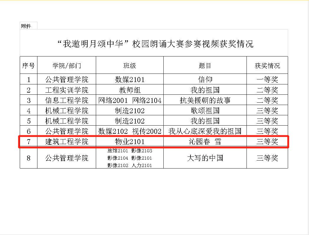为积极营造喜迎党的二十大浓厚氛围,深入贯彻落实习近平总书记视察广西“4·27”重要讲话精神,贯彻落实自治区第十二次党代会精神,根据自治区教育工委办公室“转发关于组织开展第十四届”我邀明月颂中华“爱国诗词诵读大赛的通知”要求,学院积极组织广大师生参与第十四届“我邀明月颂中华”爱国诗词诵读大赛校内选拔赛,我院选派物业2101班10名学生参赛的《沁园春·雪》诵读作品荣获本次大赛三等奖。