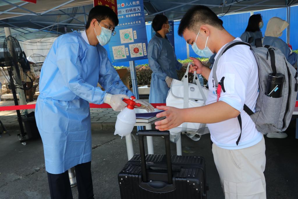 伴随着秋日的艳阳,迎来了新的学年,校园里弥漫着些许秋意。为守好入校安全第一关,所有2022级新生进入校园都要经过消毒行李、测量体温、更换口罩、查看三码等严格管控。时刻坚守在学校迎新一线的辅导员陈荣梅在采访中说到:“为保障新生顺利入学,学校对管控工作进行了细致安排,在疫情防护以及处置突发事件中都做了充足的准备。”在大门处对新生进行体温检测,并严格检查“三码一核酸”,切实守好入校安全第一关。