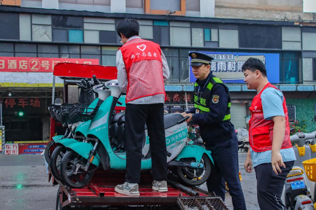 志愿者们与城管执法队员沿江北大道开展巡逻,对车辆乱停乱放等违规违法行为进行全面治理,规范摆放共享单车,引导共享单车使用者文明规范停车,确保道路交通畅通有序。