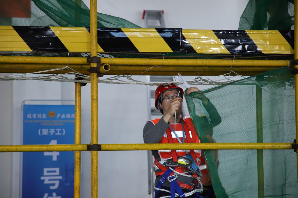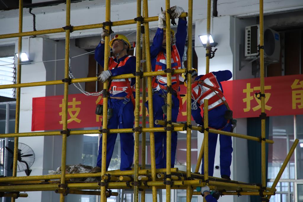 实操比赛现场,随着裁判员一声令下,选手们五人一组投入到紧张的比赛中。竖立杆、架横杆、紧插销……“搭架高手”们动作娴熟,仔细观察、严格测量,有条不紊地搭建着脚手架。对杆间距离、插销锁紧力的把握,以及对立杆、横向水平杆、纵向水平杆的搭配,都能充分体现架子工的技能水平。