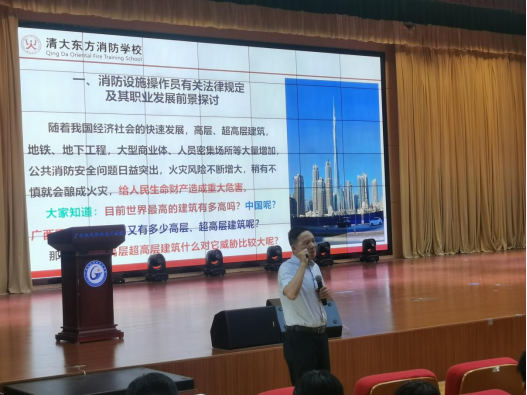 满高华老师在致辞中指出,消防安全是建筑领域的重中之重,掌握相关专业技能对建筑类学生至关重要。宣讲会上,黄乃华校长结合多年行业经验,首先详细解读了消防设施操作员相关的法律法规,强调了消防工程对保障人民生命财产安全和建筑行业健康发展的重要性,并深入分析了该职业广阔的就业前景与发展空间。随后,他介绍了清大东方消防学校的办学特色、教育资源优势及其在消防培训领域的实力,鼓励有兴趣的学生积极报名参加系统培训。最后,黄校长详细讲解了消防设施操作员的报考条件与流程,为学生备考提供了清晰的指引。