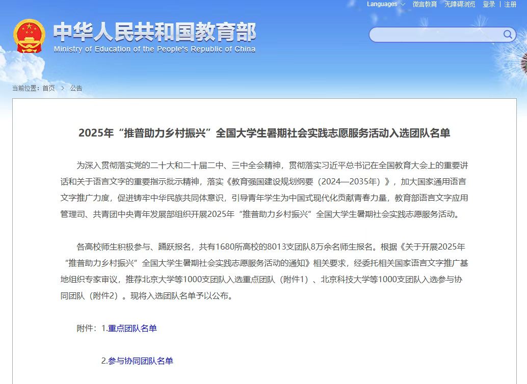 据悉,2025年“推普助力乡村振兴”全国大学生暑期社会实践志愿服务活动共有来自全国1680所高校的8013支团队报名参加,经过对各高校实践团的申报材料进行评审,全国共有北京大学等1000支团队入选重点团队。项目旨在引导和教育广大青年学生志愿服务乡村推普工作,为全面建设社会主义现代化国家、全面推进中华民族伟大复兴贡献青春力量。